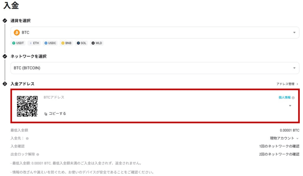 ・入金したい暗号資産として、今回は「BTC」を選択します。