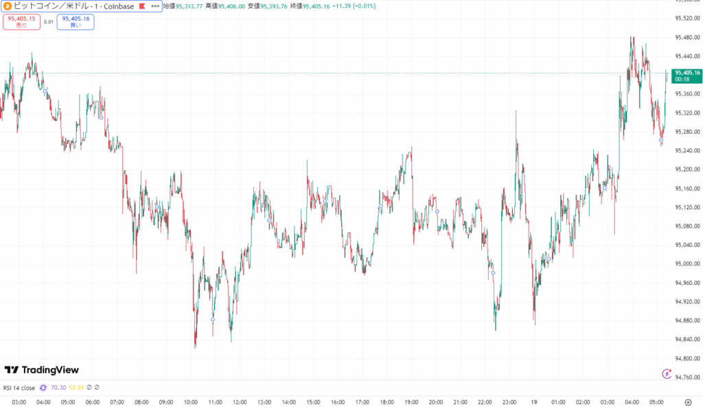 深夜帯にかけて一時9万4800ドル台まで下落したものの、その後は買い戻しが入り上昇傾向に転じ、9万5400ドル台を回復する場面も見られました。