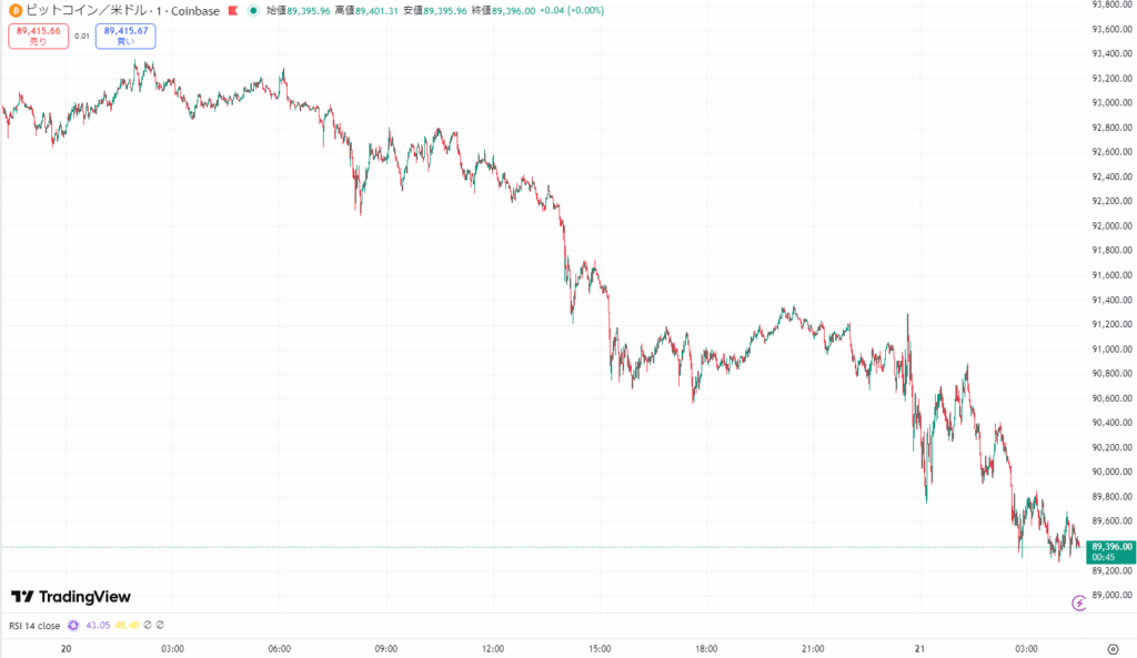 ビットコインは本日1日を通して大きく下落し、9万3000ドル台から8万9000ドル付近まで急落しました。
