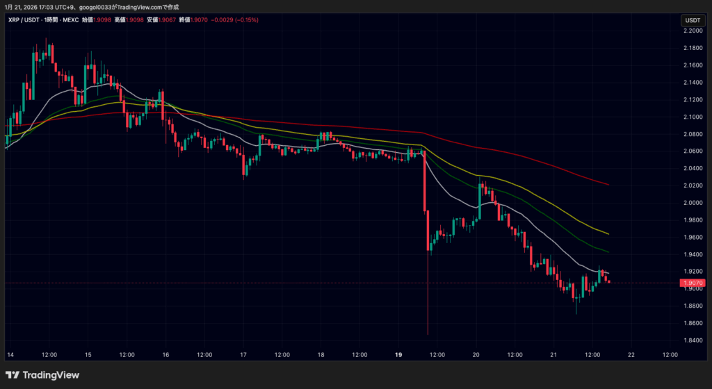 1月19日の下落で2ドルを割り込んだXRPは、20日から21日朝にかけてさらに続落し、一時1.87ドルまで下落した後に反発しました。