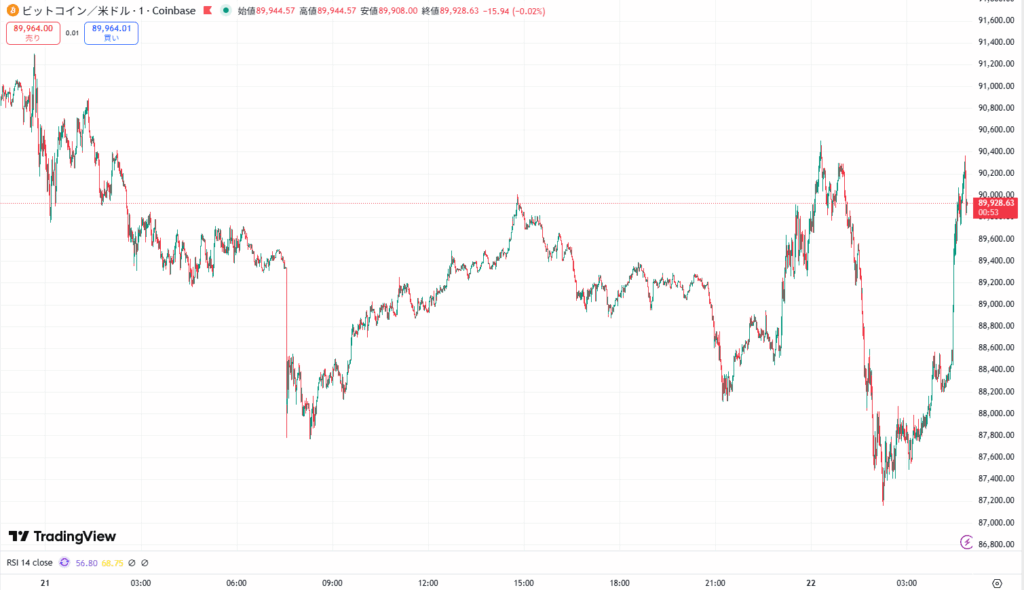 ビットコインは本日午前1時から2時の間に一時8万7000ドル台まで下落するもそのあとは買い戻しが入り9万ドル台まで回復しました。