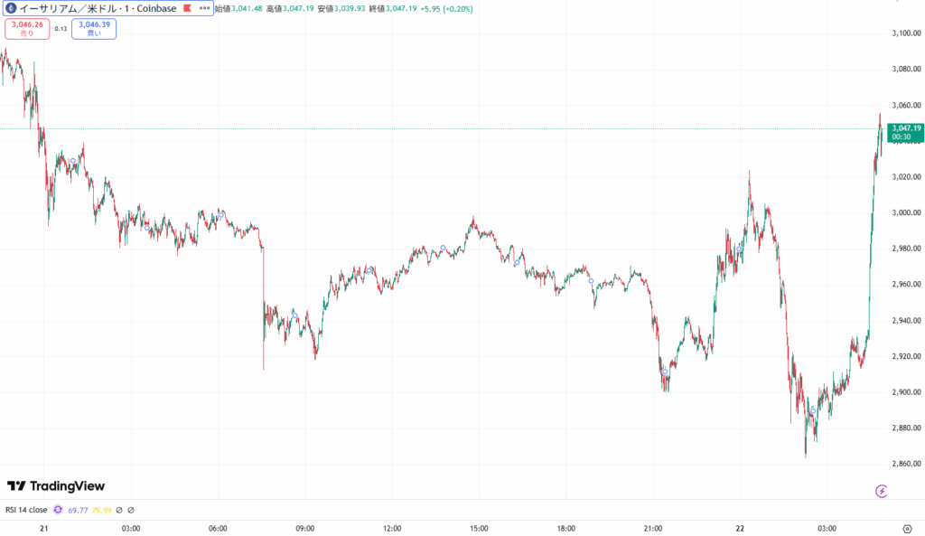 イーサリアムはビットコイン同様の推移で、午前2時に2860ドルまで下落後、そのあとは買い戻しが入り3050ドル台まで回復しました。