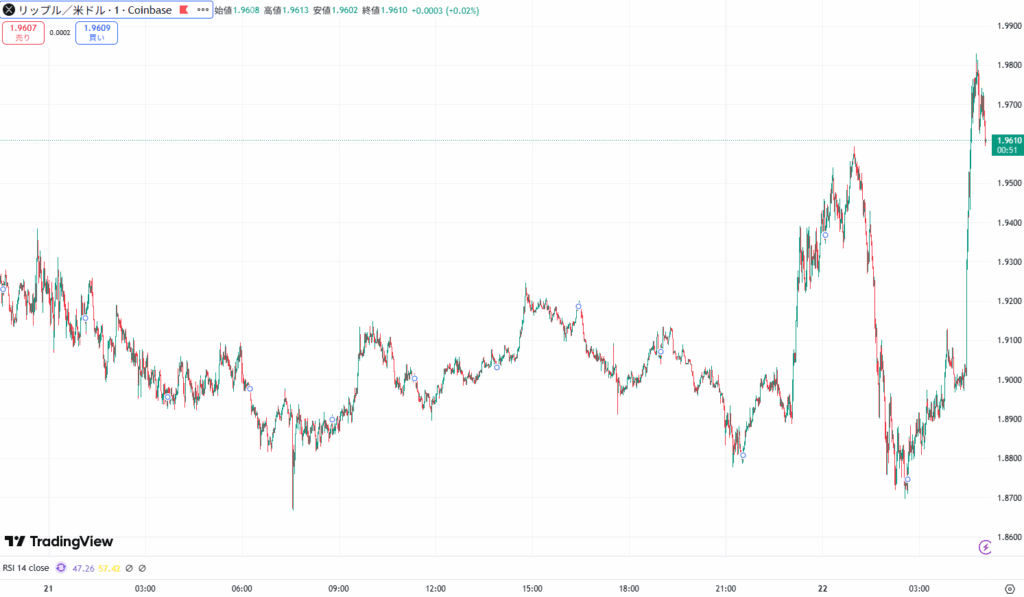 XRPもビットコイン同様に下落し、午前2時に1.87ドルまで下落後、そのあとは買い戻しが入り1.984ドル台まで回復しました。