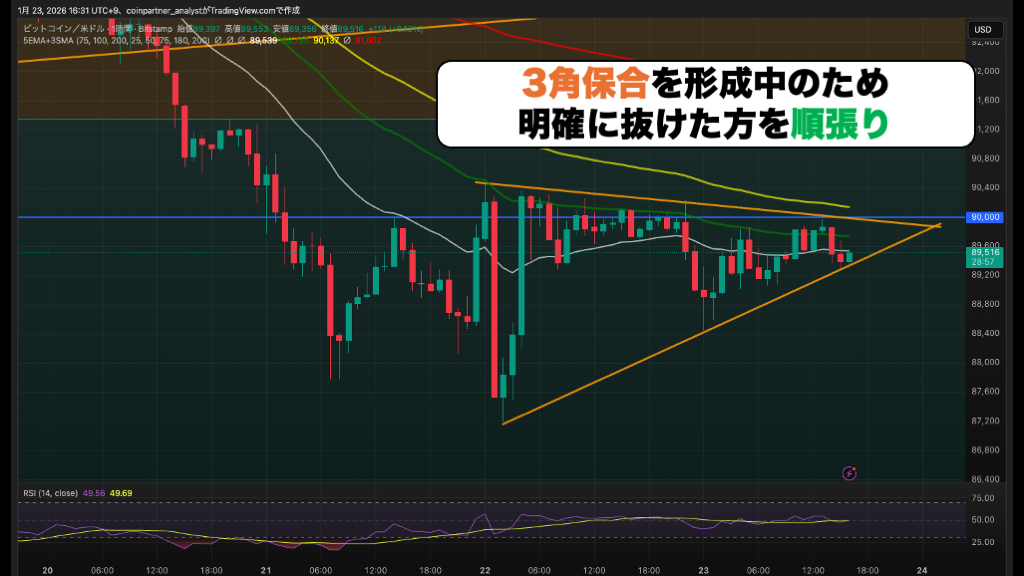 1時間足では、9万ドル付近で三角保合を形成中です。高値の切り下げと安値の切り上げが同時に起こっており、価格が収束してきています。