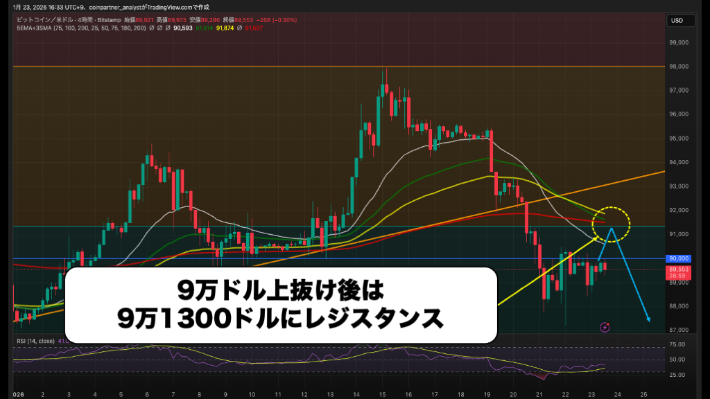 ・9万1300ドル付近は4時間足MAが重なる強いレジスタンス