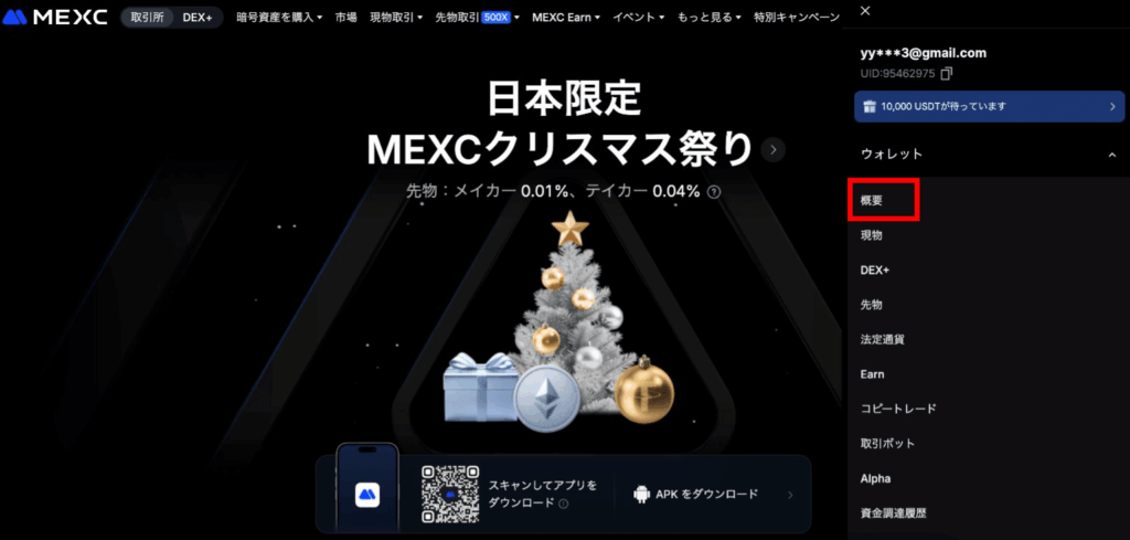 1.ログイン後、画面上部または左側のメニューから「ウォレット」から「概要」を選択してください。