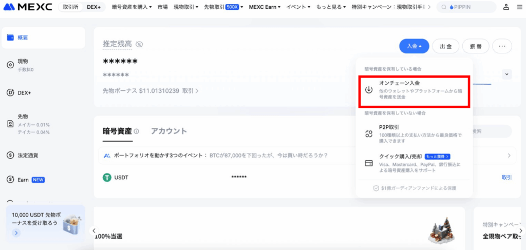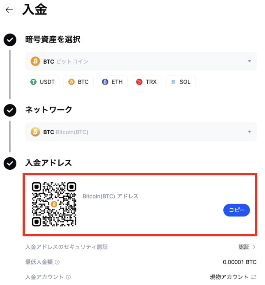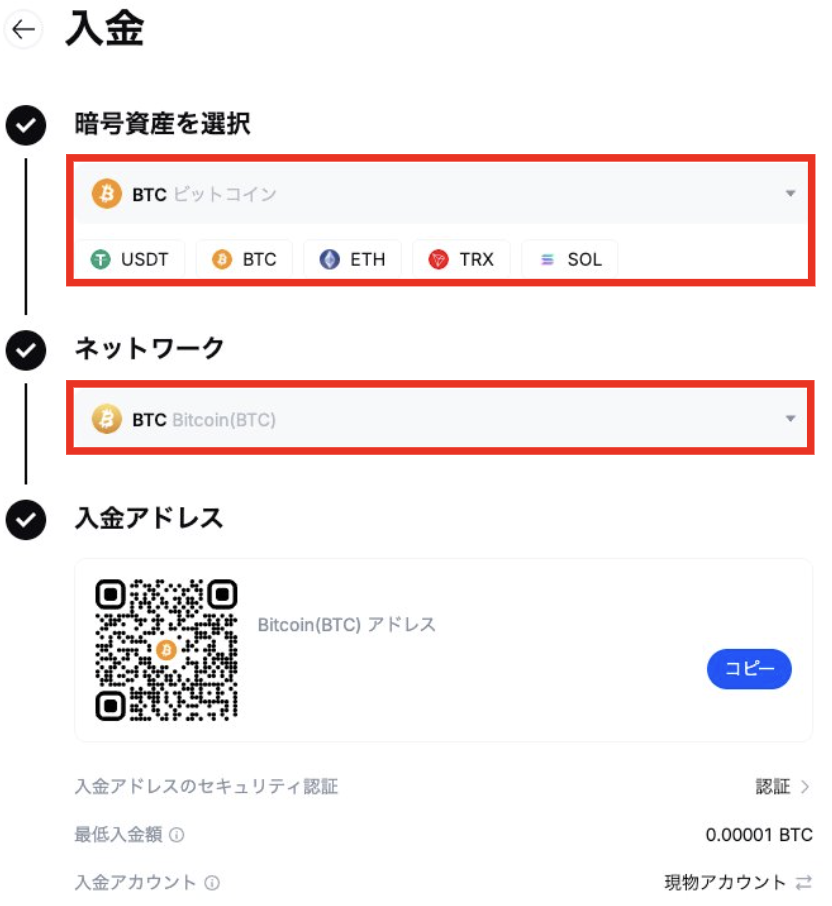 - MEXCで正しいネットワークと暗号資産を選んで入金アドレスを取得