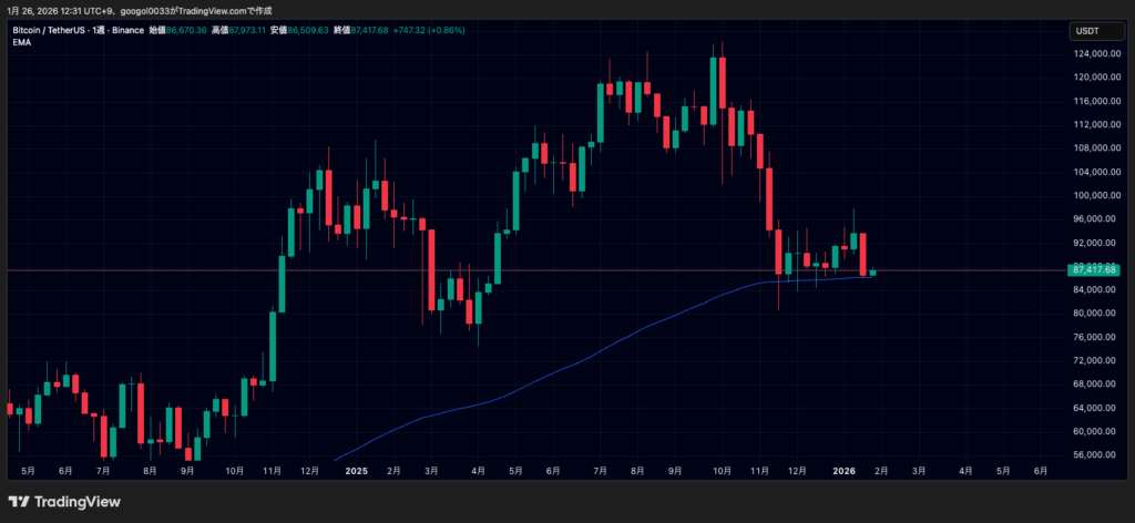 ビットコインは一時86,000ドル台まで下落しましたが、週足100EMA付近で下げ止まり、現在は87,400ドル付近まで反発しています。