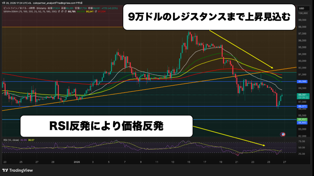 4時間足では、先週の急落後にRSIが30付近の売られすぎゾーンから反発しつつある状況です。短期的には買い戻しの動きが入りやすく、8万9000〜9万ドル付近までの反発は十分に期待できます。