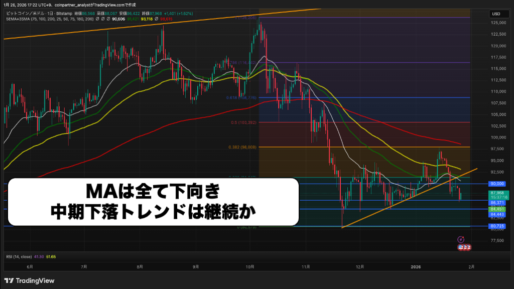 日足チャートでは、2025年10月の史上最高値から続く下降トレンドが依然として継続しています。短・中・長期移動平均線がすべて下向きに推移しており、典型的な弱気相場の形状を示しています。