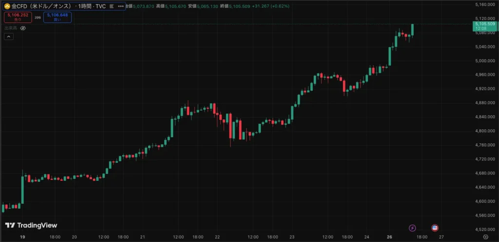 金(ゴールド)は同じ期間に明確な上昇基調を描きました。1月22日頃には4,790〜4,820ドル付近で推移していましたが、23日には4,940ドル台まで上昇しました。さらに買いが続き、1月26日時点では5,081.43ドルを記録しています。1週間での上昇率は5〜8%程度となり、5,000ドルを上回る史上最高値圏に到達しました。