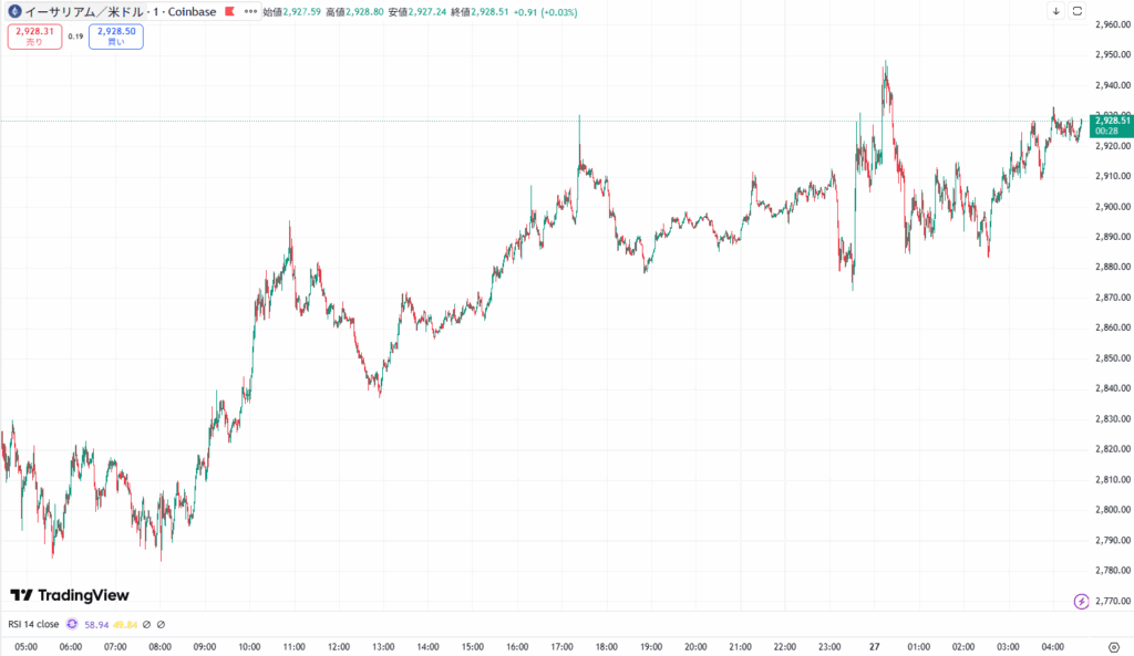 イーサリアムはビットコイン同様に上昇し、午前0時に2960ドルまで上昇後、売りが一巡し現在は2910ドル台を推移中です。