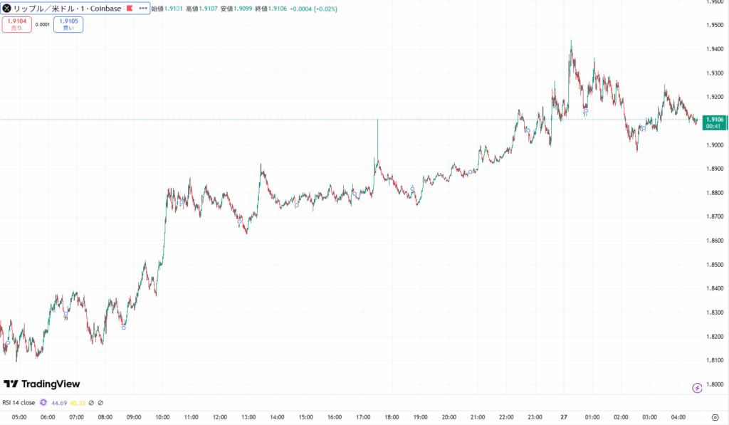 XRPもビットコイン同様に上昇し、午前0時に1.944ドルまで上昇後、売りが一巡し現在は1.91ドル台を推移中です。