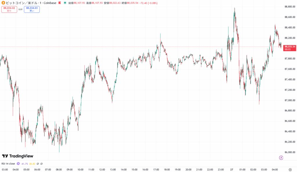 ビットコインは午前0時に8万8800ドル付近まで上昇後、売りが一巡し現在は8万7900ドル台を推移中です。
