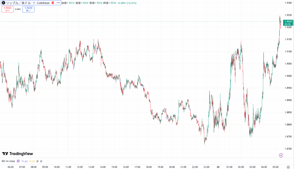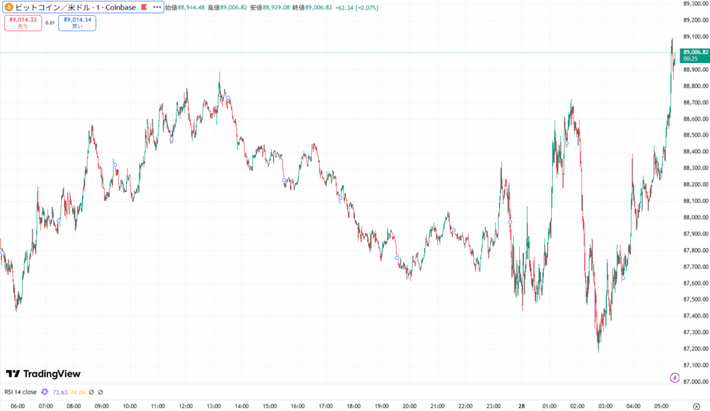 昨日午前5~6時にかけて8万8300~8万7440ドル付近まで下落後、午前6~午後1時にかけて8万7440~8万9000ドル付近まで上昇しました。