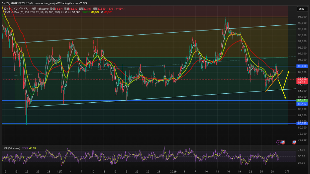 1時間足では、8万7500ドル付近の並行ラインでサポートされるかどうかが本日の焦点です。FOMC後の下落から一旦は持ち直していますが、今後の値動きは以下2パターンを想定しています。