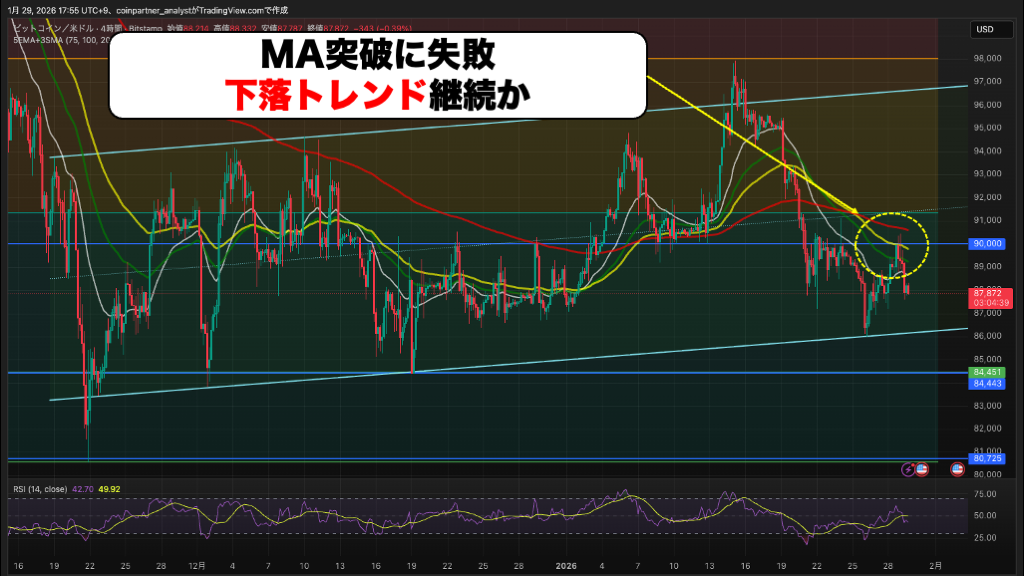 4時間足では、各MA(移動平均線)は全て下向きに推移しており、中期的なトレンドは依然として下落方向を示唆しています。昨夜のFOMC後に9万ドル突破を試みる動きがありましたが、レジスタンスに阻まれて反落しました。