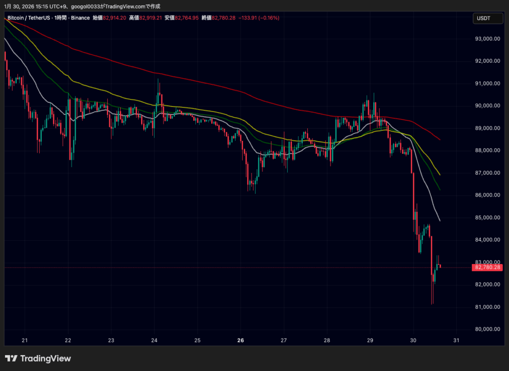 2026年1月30日15時時点で、ビットコイン(BTC)は8万2897ドルと前日比2.07%下落し、金(ゴールド)は1オンス当たり5187ドルと3.56%下落しました。