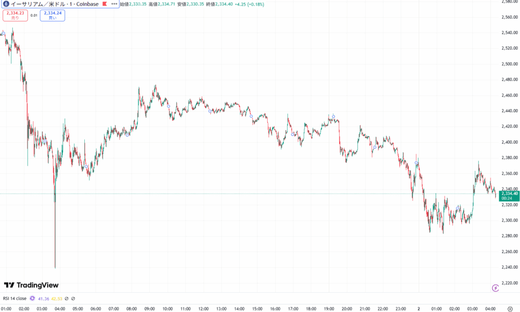 イーサリアムは本日2352ドルから2475ドルまで上昇後、2284ドル付近まで下値を試す下落後に2300ドル付近を推移しています。