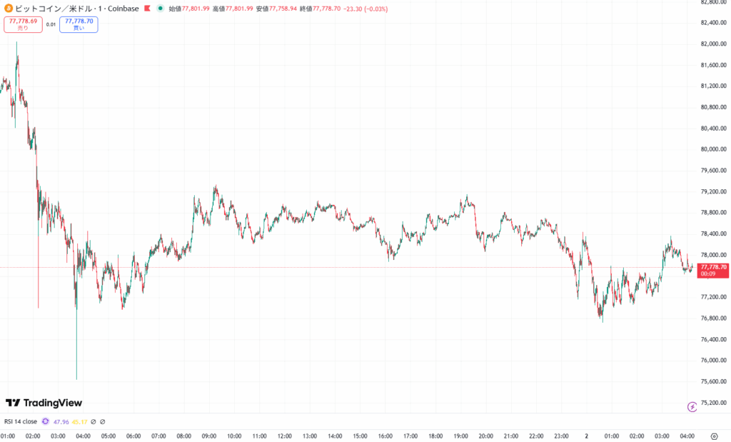 午後10時~午前1時台にかけて7万7870~7万7181ドル付近まで急落しました。