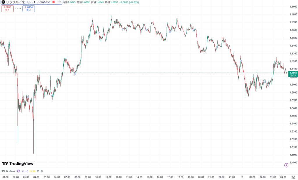 XRPは本日1.547ドル台から一時的に1.68ドルまで上昇し、現在は1.6ドル台を推移しています。
