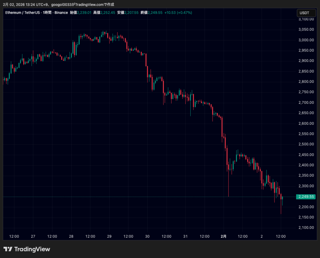 2月1日時点では2400ドル台で取引される局面が見られましたが、その後は水準を切り下げ、2月2日まで下落基調で推移しました。