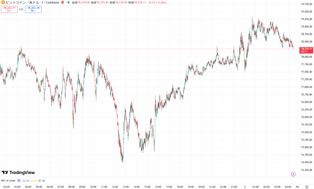 午後3時~午前1時台にかけて反発し、一時7万9270ドルまで上昇後、午前5時までやや下落よりの横ばい推移をし、現在7万8350ドル辺りを推移中です。