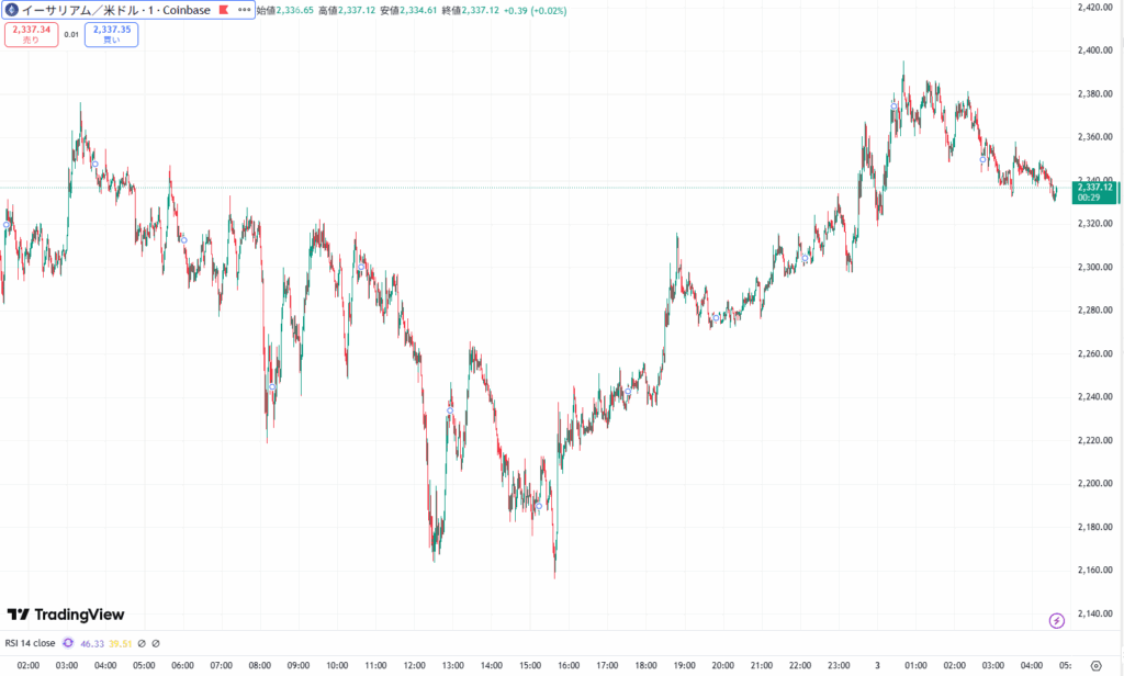 イーサリアムは本日午前中~午後4時頃までに2346ドルから2155ドルの乱高下を繰り返した後、反発し2336ドル付近を現在推移中です。