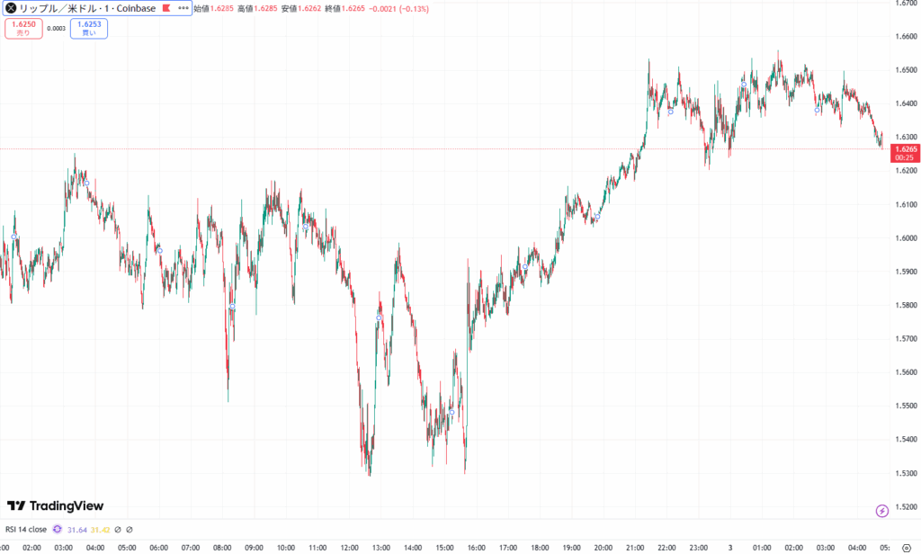 XRPは本日午前中~午後4時頃までに1.6175ドルから1.53ドルの乱高下を繰り返した後、反発し1.63ドル付近を現在推移中です。