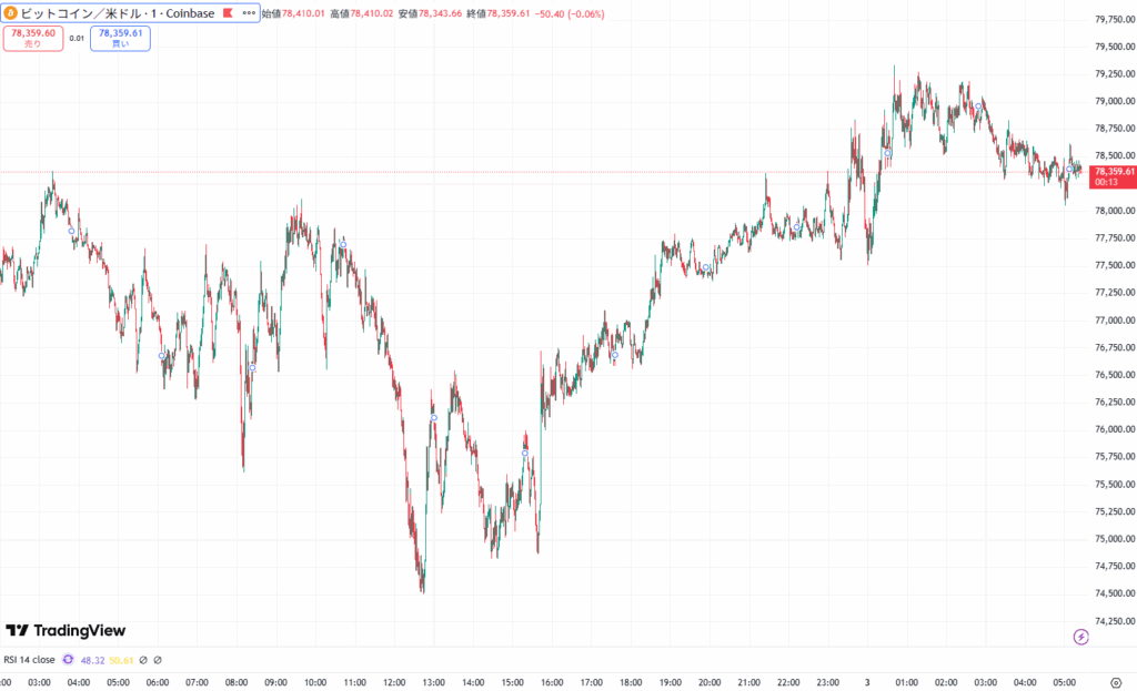 直近のビットコインは7万8400ドル付近からスタート後、一時的に7万4500ドル付近まで下落しました。その後は反発し、7万9000ドル台に迫る勢いを見せましたが、再び下落し7万8300ドル台で推移しています。