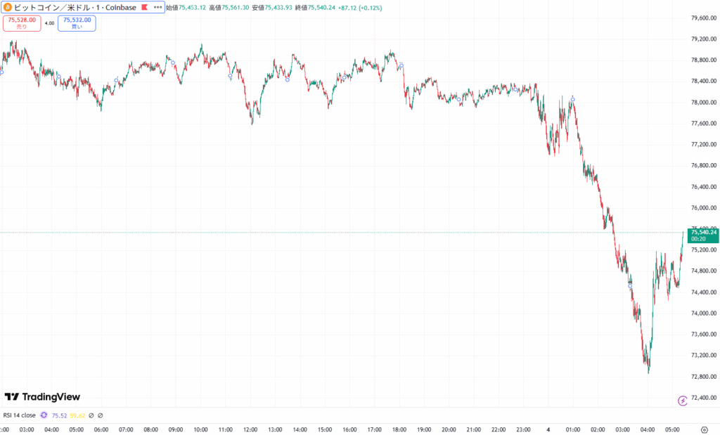 午前1時頃から7万8140ドル付近から急落が始まり、一時は7万2850ドル近辺まで下落しました。