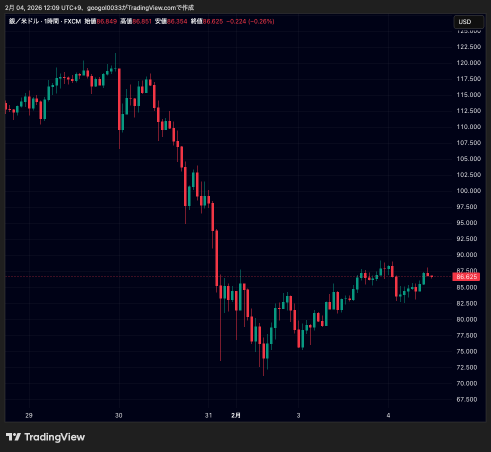 銀は約120ドルから約72ドルまで約40%も値を落としましたが、約86ドルまで回復しています。