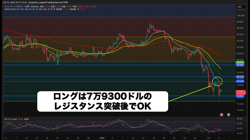 ロングを検討する場合は、7万9300ドルを突破してからでも遅くありません。現時点では「落ちてくるナイフを掴む」リスクが高いため、明確なテクニカルシグナルを待つ姿勢が重要です。