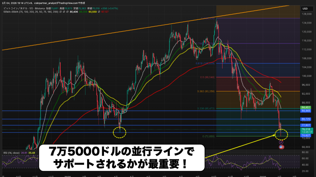現在は7万5000ドル付近まで反発していますが、このラインは極めて重要なサポートであり、ここを維持できるかどうかで今後の方向性が決まります。