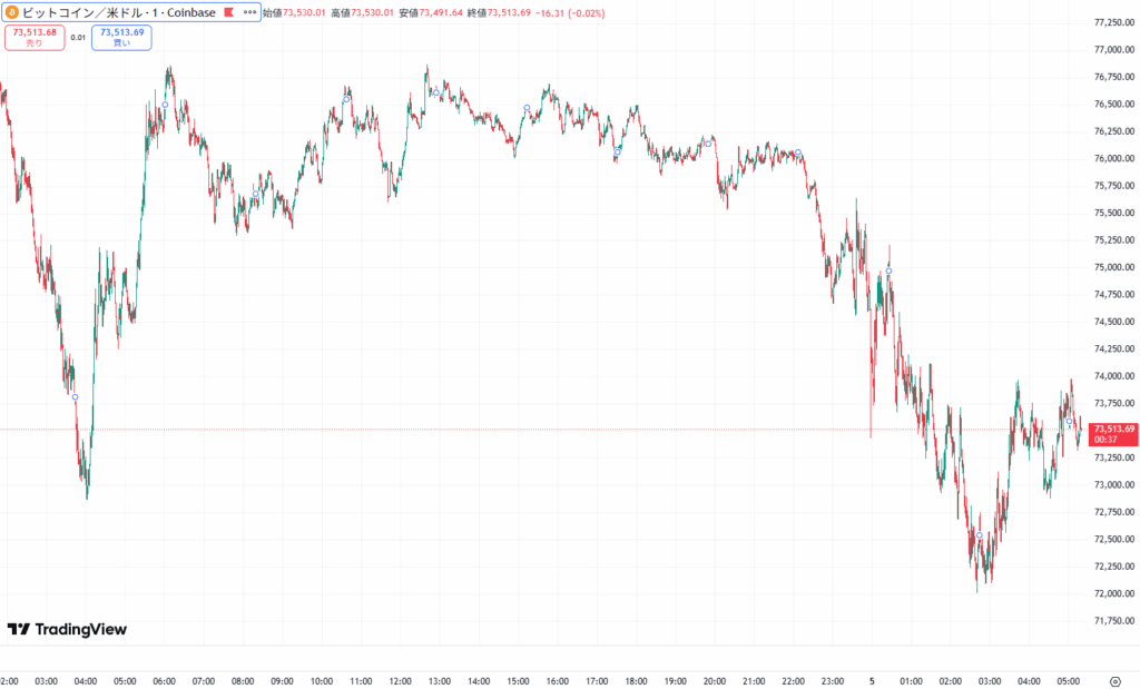 本日のビットコインは現在7万3513ドル付近で推移しています。