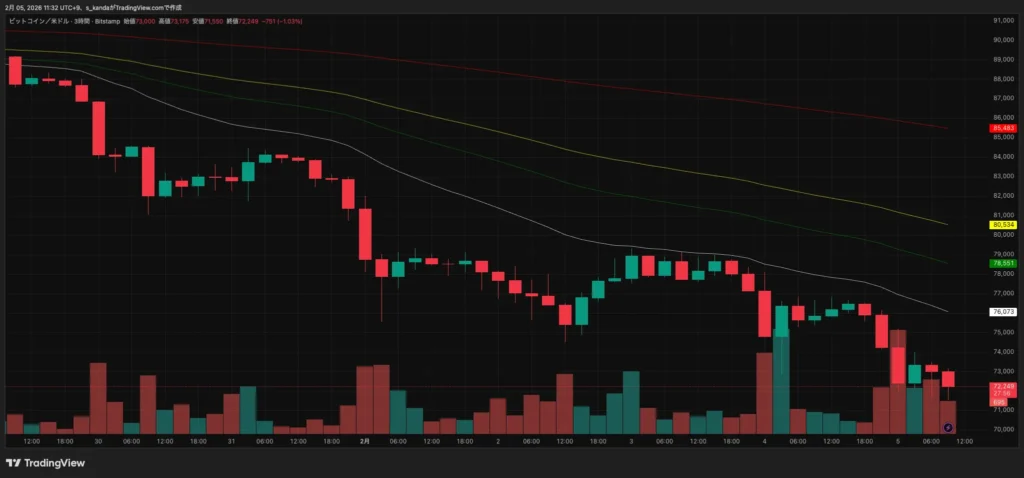 1月下旬には8万ドル台後半で推移していた局面もありましたが、2月に入ってからは下落基調が鮮明となり、短期間で1割近い価格調整となっています。