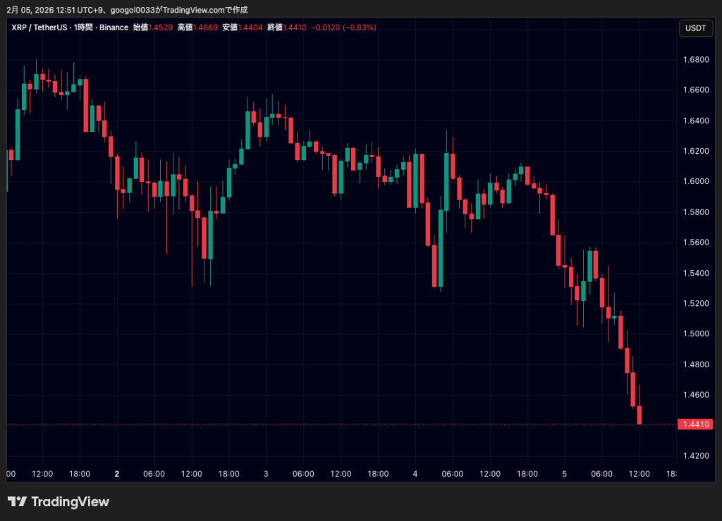 リップル(XRP)は2月3日の1.67ドル付近から下落が続き、5日正午には1.4558ドルまで値を下げました。