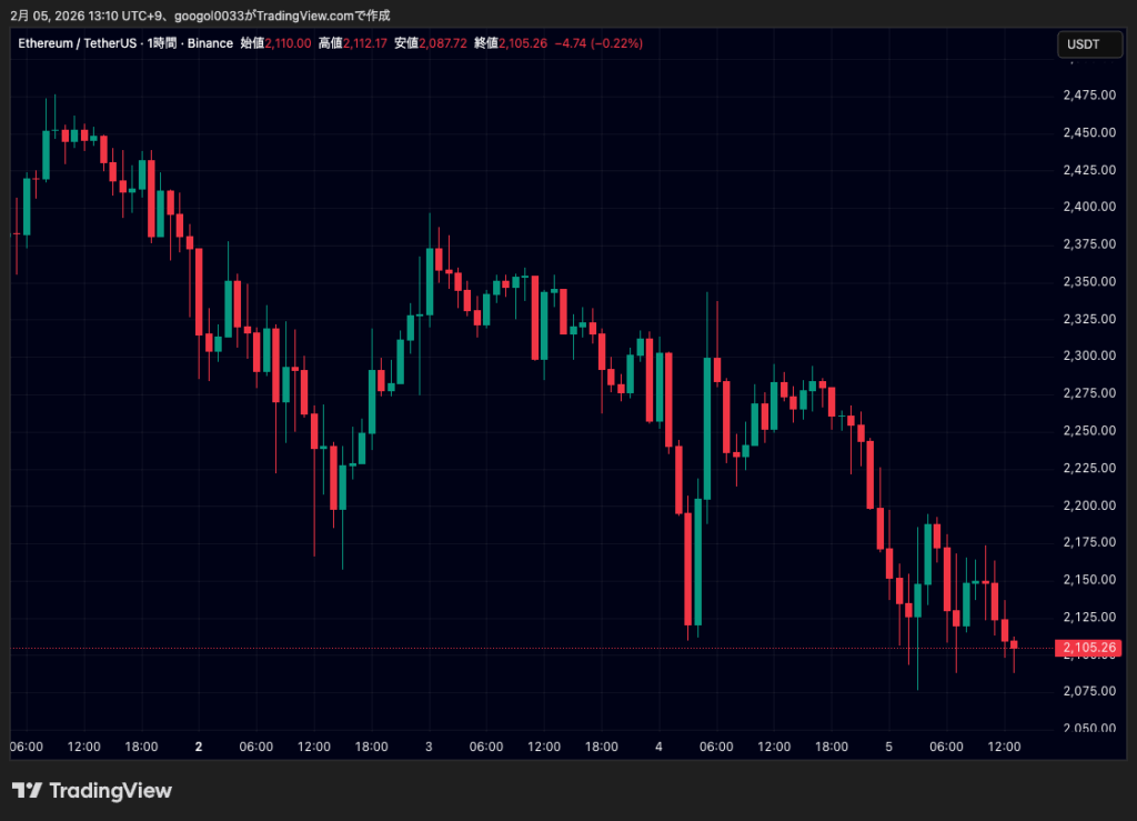 イーサリアム(ETH)は2月3日に2350ドル付近で取引されていましたが、4日には2200ドル台へ下落し、5日正午には2109ドルまで値を下げました。