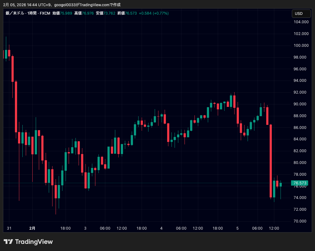 同じ時間帯の取引で、金は4800ドル台後半、銀は74ドル近辺で推移しました。両者とも調整局面にある中、銀の下落率が相対的に大きくなっています。