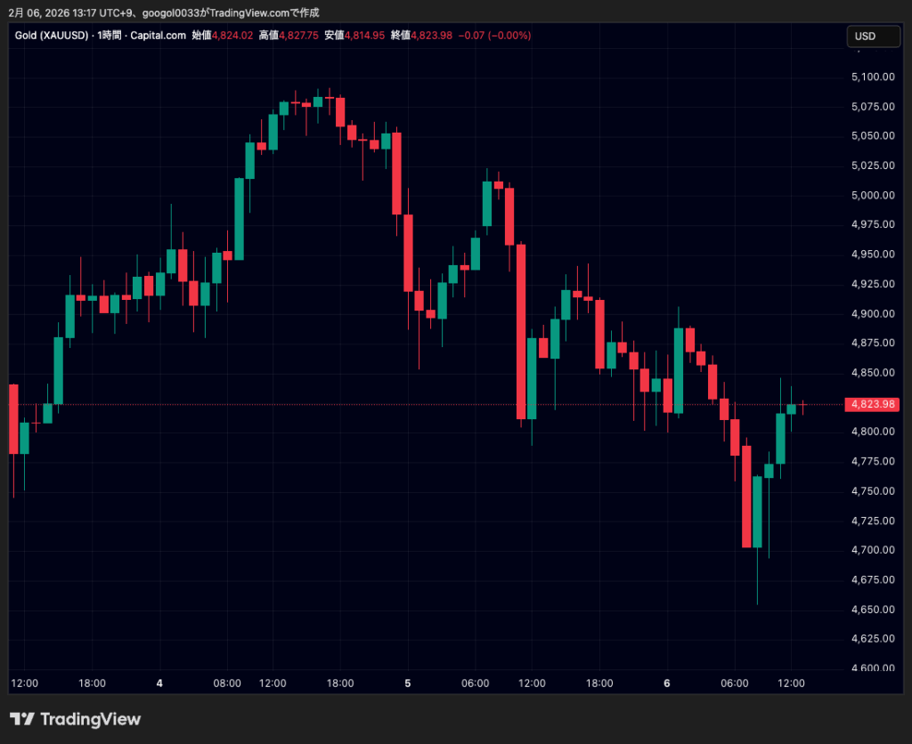 6日の金価格は、4700ドル台後半から4800ドル台前半を中心としたレンジで推移し、下落局面でも押し目では買いが入りやすい状況が続きました。