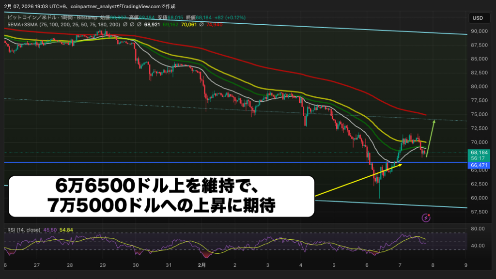 1時間足では、昨夜の急反発から一服、調整局面に入っています。昨日早朝に6万ドル台まで下落した後、欧米時間にかけて強い買い圧力が入り、7万2000ドル付近まで一気に上昇しました。