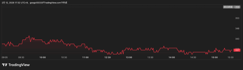 16時時点では337円と、前日比21円安(約5.9%安)で推移しています。本日の値幅は334円から344円でした。