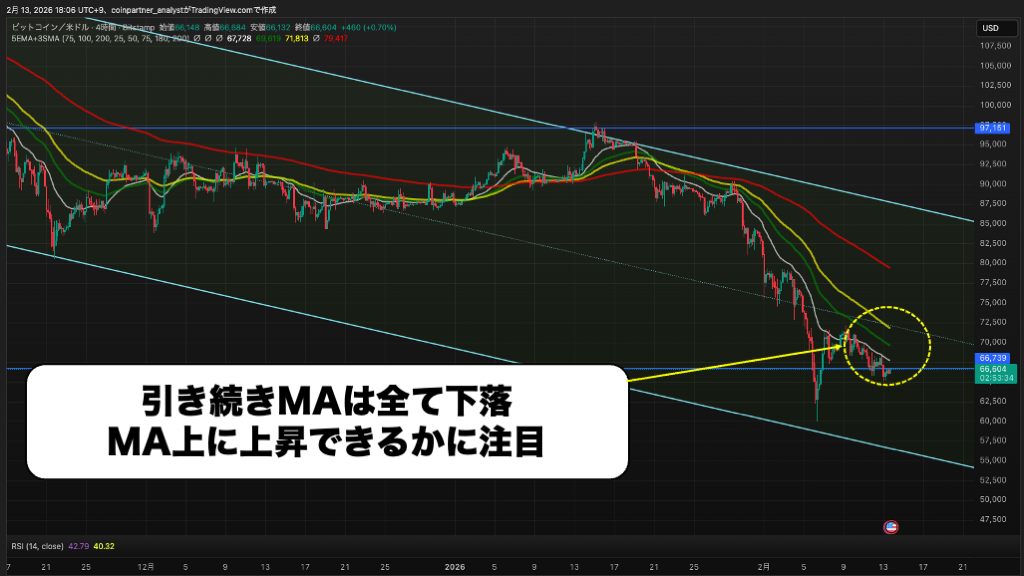 現在の価格帯(6万6000ドル付近)から7万5000ドルまでは約13%の上昇余地があり、日足ベースでは戻りを試す展開が期待できる位置にいます。ただし、日足の各MAは全て下向きのままであり、本格的なトレンド転換にはまだ時間がかかりそうです。