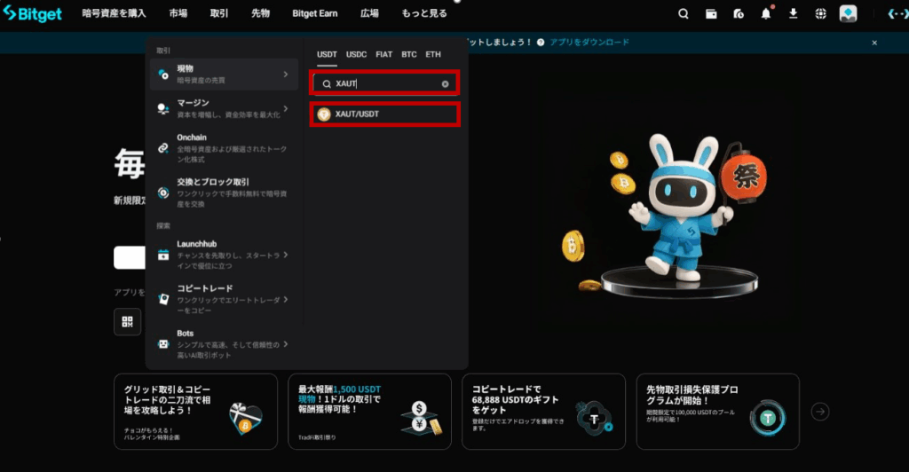Bitgetの口座開設が完了したら、XAUTを購入していきます。