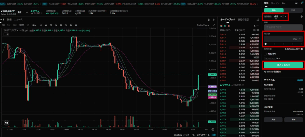画面上部の検索窓に「XAUT」と入力、「XAUT/USDT」取引ペアを選択します。