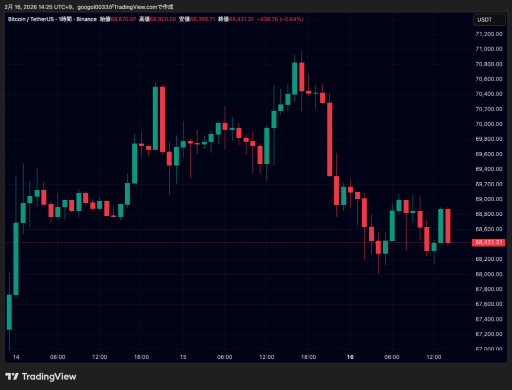 前日に7万900ドル付近まで上昇した反動もあり、上値は重く、6万8460ドル台まで下押しする場面がありました。