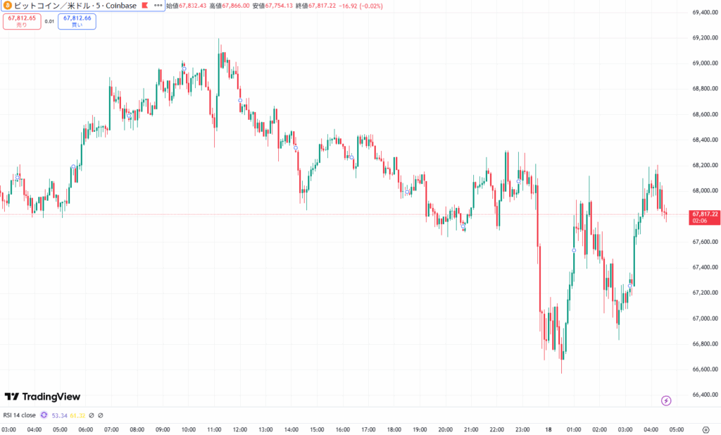 特に深夜帯には急落が発生し、6万6900ドル付近まで急速に下落しました。