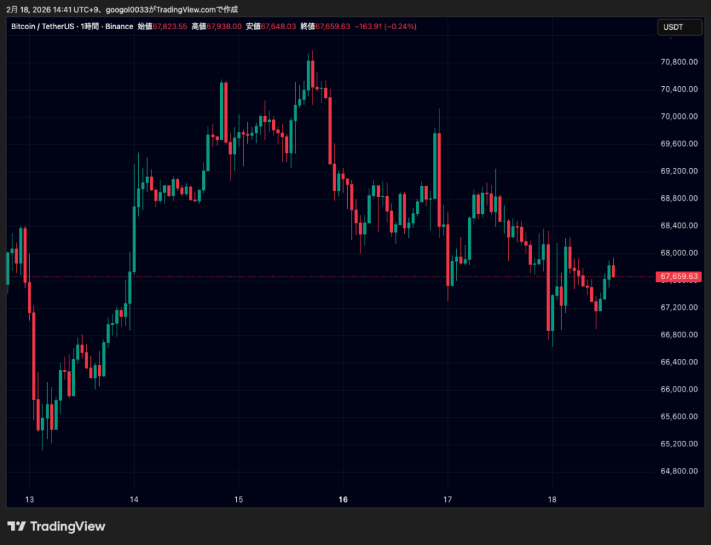 きょうは前日の急落後の反動局面にあり、直近は6万6600ドル台後半から6万7700ドル台のレンジでの推移となっています。