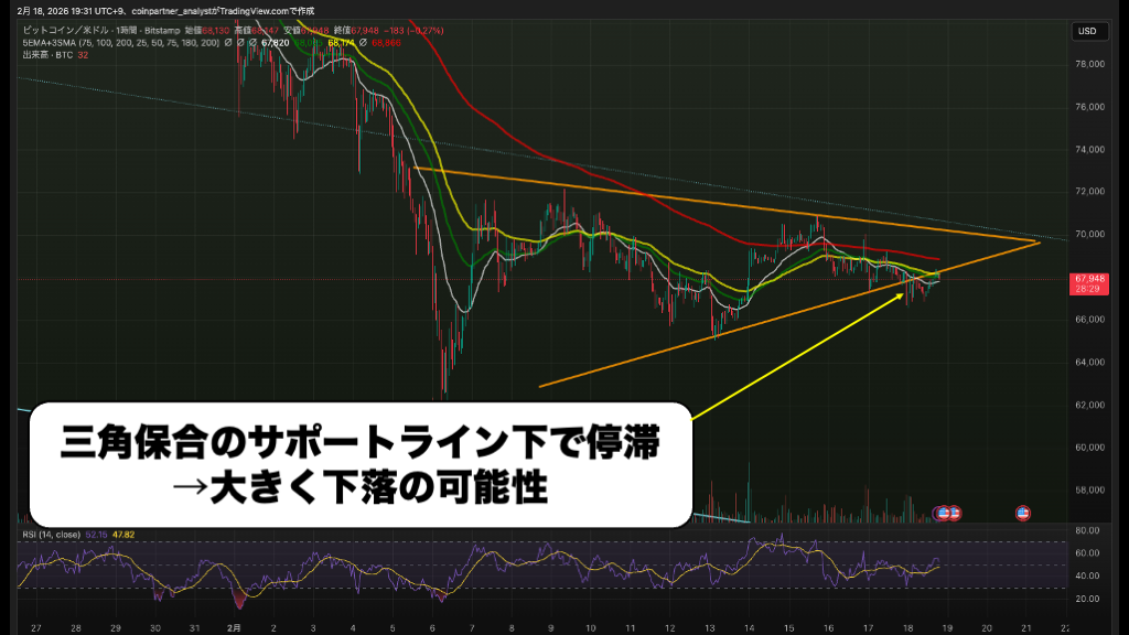 1時間足では、直近まで形成していた三角保合の下限ラインを割り込む動きが確認されています。三角保合のサポートラインとして機能していた6万7000ドル付近が、今後はレジスタンスとして上値を抑える「サポレジ転換」が起きるかどうかが最大の注目ポイントです。