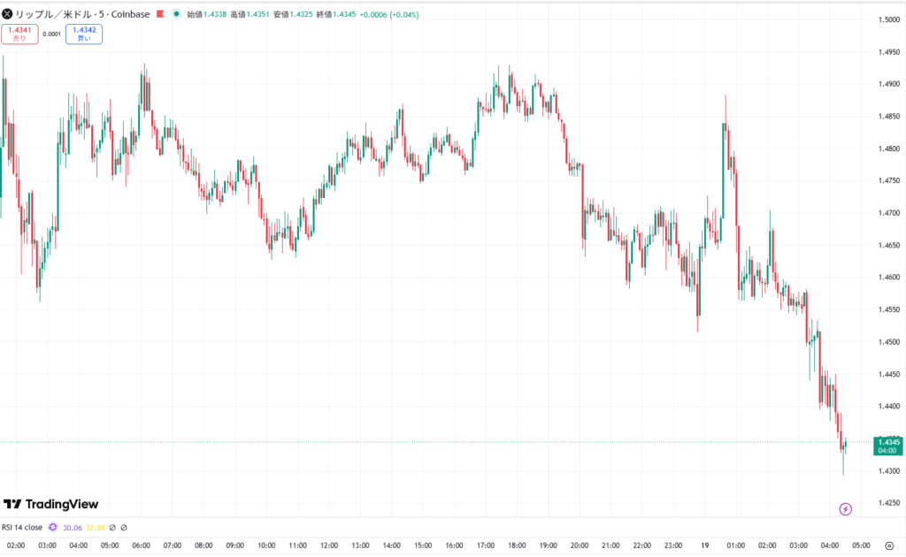 リップルもビットコインと概ね似た推移で日中にかけて上昇後、夜間にかけて5%以上の下落をしました。